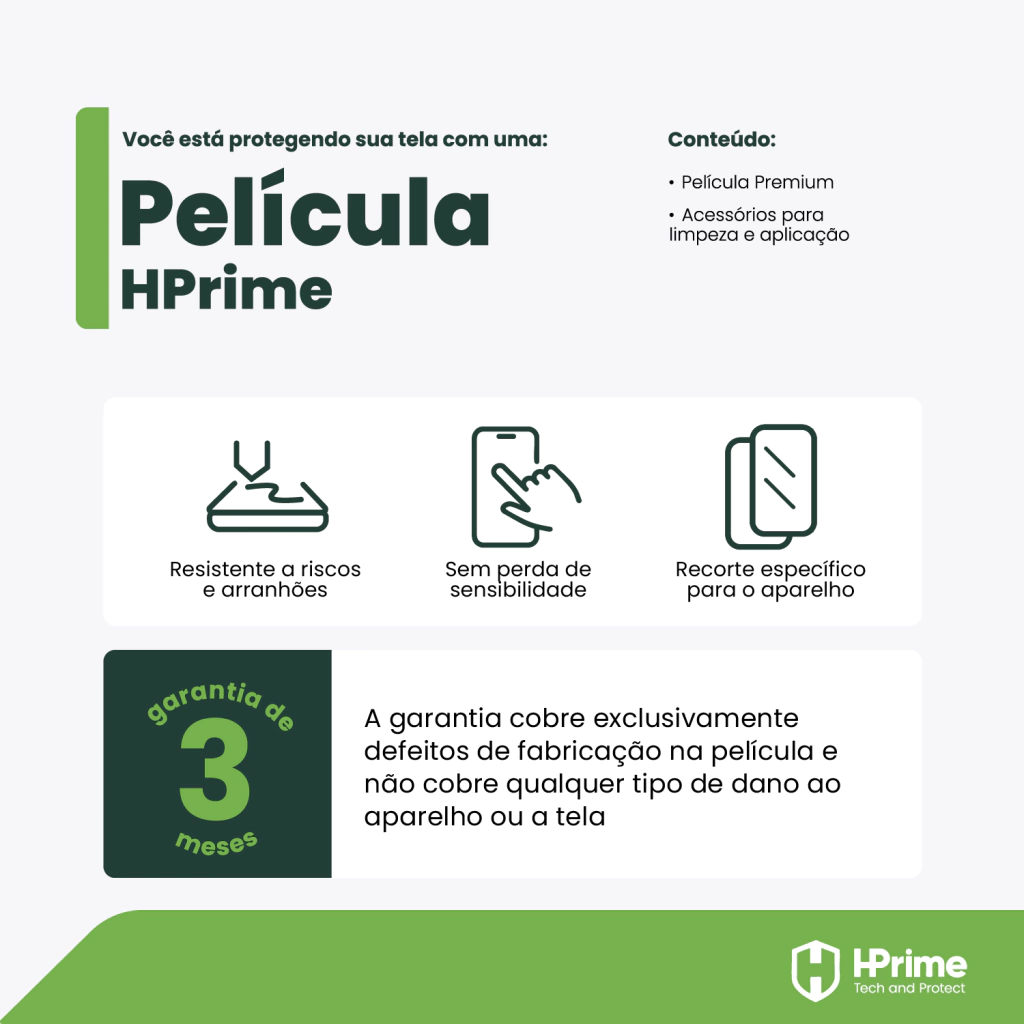 3 meses para defeitos de fabricação na película (não cobre danos ao aparelho ou à tela).